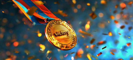 A gold medal hangs against a bright background, surrounded by sparkling confetti that enhances the atmosphere of celebration and achievement during a victory moment.