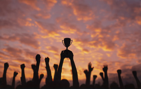 Hands reach up to celebrate a victory, holding a trophy high against a stunning sunset backdrop with colorful clouds. The moment captures joy and achievement..