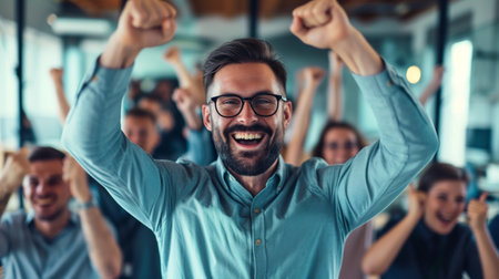 A victorious individual enthusiastically immersed in a vibrant and lively celebration setting