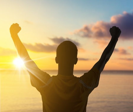 silhouette of man show arm up for achievements successful and celebrating success with sunrise