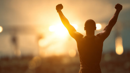 A joyful athlete celebrates a hard-earned victory at sunset, arms raised high, surrounded by an inspiring glowing background, encapsulating pure emotion and triumph.