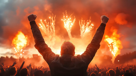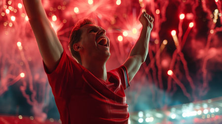 Cheering football fan in red jersey with raised hands on the background of fireworks.