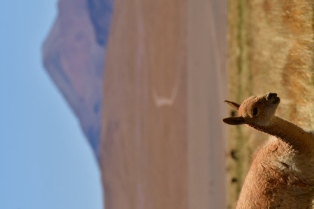 Cile Atacama desert guanacos in nature in a sunny day in the morning