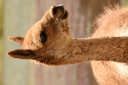 A picturesque scene, a brown llama in a pen. The concept of animal husbandry and rural life. Portrait of a smiling lama in the fresh air. Close-up. A pet on a private eco-farm. Agricultural industry.