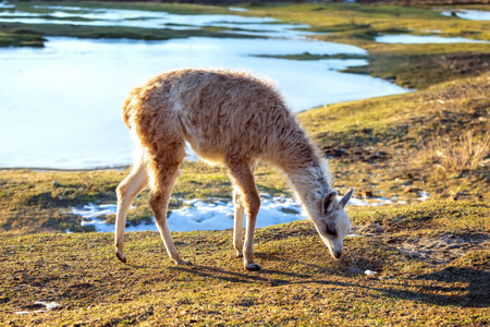 A young llama (Lama guanaco) grazes on a grassy patch near water body in a natural landscape under sunlight