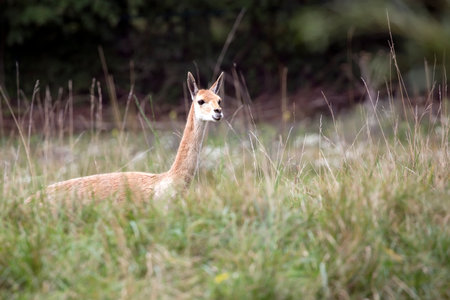 vicugna or vicuna male, a camelid specie specific to the Andes highlands in south America guarding his flock. shot in the wild in Chimborazo fauna reserve in Ecuador.