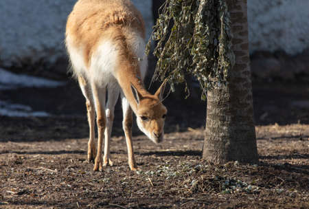 Vicuña standing and looking alert in a zoo habitat, showing elegant long neck and soft beige fur against a blurred background