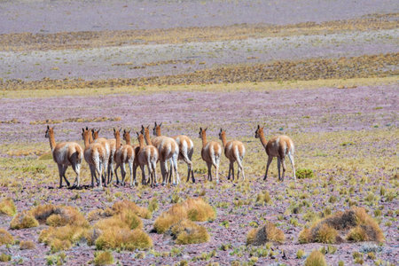 Watchful Herd of Vicugnas (Vicugna vicugna) in their natural environment.