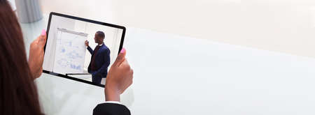 Woman watching performance of motivational speaker on laptop at white table, closeup
