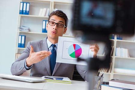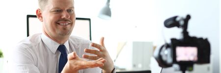 Portrait of smiling man holding online financial seminar for video blog. Guy in classical shirt and tie sitting at workplace drinking coffee and talking at camera. Blurred background