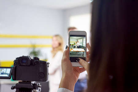 Education video blog filming backstage concept. creating video tutorials. social network activity.