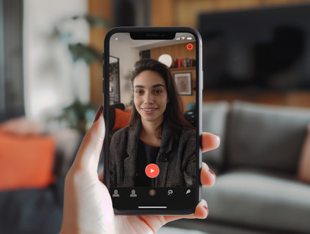 A hand holding a smartphone displaying a cheerful woman ready for a video call, with a cozy home interior in the background.