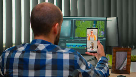 Freelancer video editor with disability in wheelchair having videocall while editing postproduction an project creating content in modern company office. Videographer working from photo studio