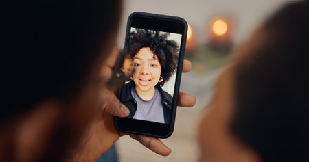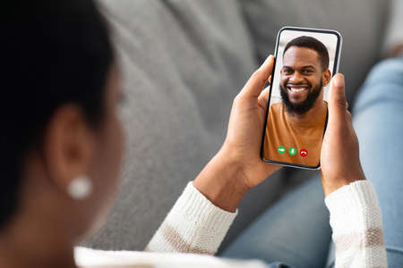 Unrecognizable Black Woman Holding Smartphone At Home, Making Video Call