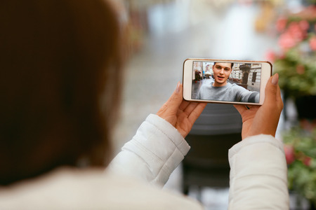 Woman doing video call with her man on smart phone during stay at home due to coronavirus pandemic, selective focus on phone