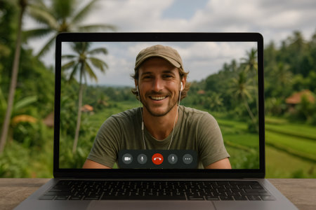 Young smiling man wearing earphones and a cap having a videoconference on a laptop from Bali, Indonesia