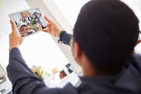 back view of asian man has video chat with friends by digital tablet at home