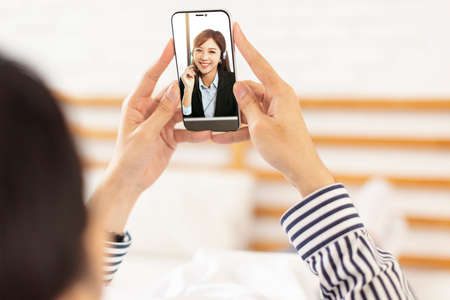 Video call conference, Happy girl having a video chat on mobile phone at home, Asian woman talking video call on a smartphone, Female people greeting with family, friend by using online telecommunication, Social distancing
