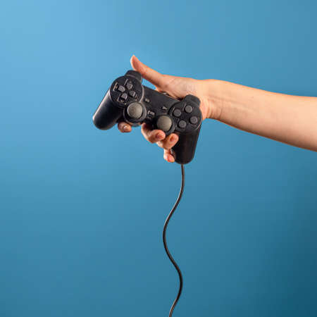 Play computer games, a hobby is computer video games, a joystick in your hand. A female hand holds a gamepad with a wire, a photo on a blue background