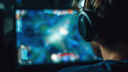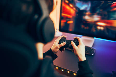 Man in headphones playing with a gamepad a computer game on desktop PC. Concept of game addiction, home leisure