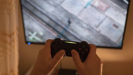 Entertainment, home electronics, gaming concept: a teenager hands holding wireless controller gamepad playing console video game