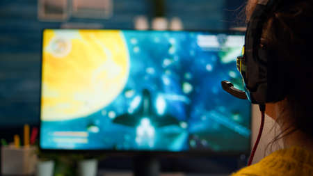 Closeup back up of woman portrait of professional gamer playing computer video game talking into headset with teammates on championship. Diverse esport team of pro gamers playing at computer