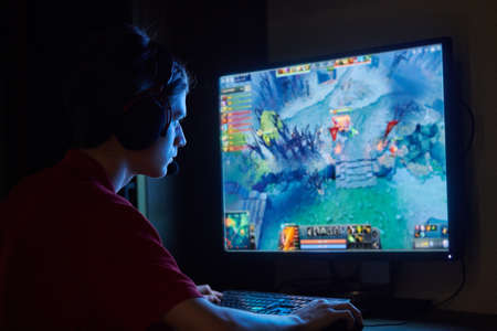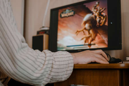Back view of adult Man gamer using computer for playing online role-playing game World of Warcraft at home. Games for adults in Self Quarantining, Social Distancing. Kropivnitskiy, Ukraine, March 25, 2020
