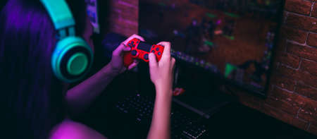 gamer playing the online game with joystick controller in neon glow dark cyberpunk room, gaming and e-sports challenge tournament streaming, streamer with analog device in living house