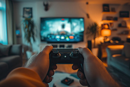 A hands holding game controller, playing video game in dark room, focused and intense atmosphere