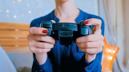 detail of a girl's hands holding a game console controller. Video game concept