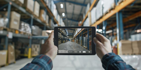 Factory worker use future holographic screen device to control manufacturing machine in factory . Concept of futuristic automation technology , virtual augmented reality and smart visualization .