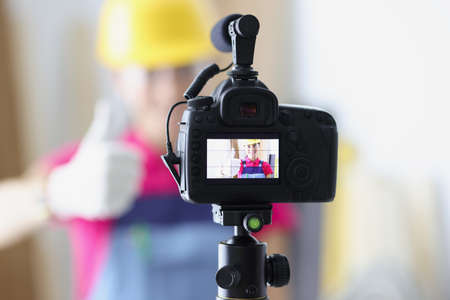 Close-up of videocamera with female repairer in helmet showing thumb up gesture to camera