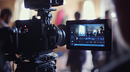 A camera positioned in a studio captures a video editing process with a blurred subject on a large monitor.