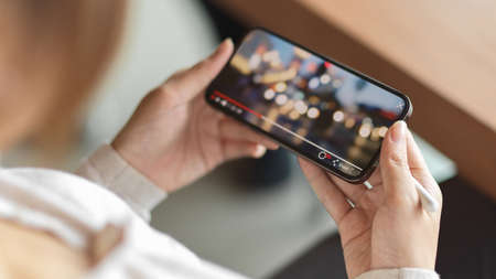 Cropped shot of female hand holding mobile phone playing video stream online.