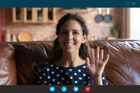 Head shot computer screen view smiling young woman waving hand, saying hello, looking at camera, greeting friends or relatives, chatting online, using webcam and social media apps at home