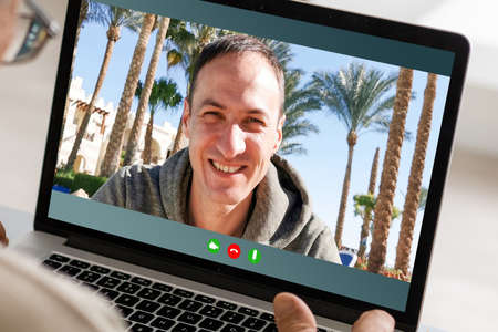 Unrecognizable man talking on videoconference with friends from a coffee shop