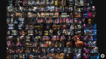 A dynamic display features numerous colorful images highlighting innovation and digital art in a contemporary setting.