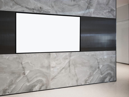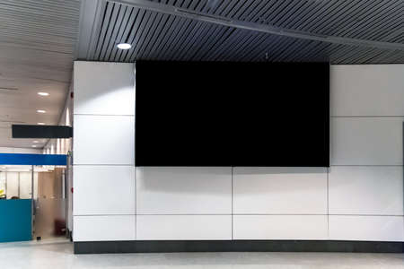 billboard or advertising poster in the airport for advertisement concept background. A large black screen on a white wall in the waiting room train station, bus terminal. Billboard in a public place
