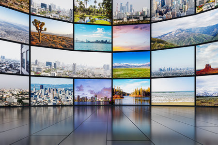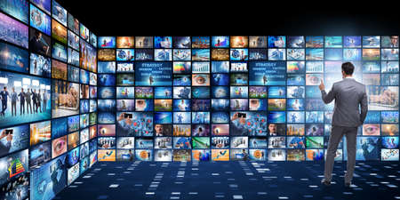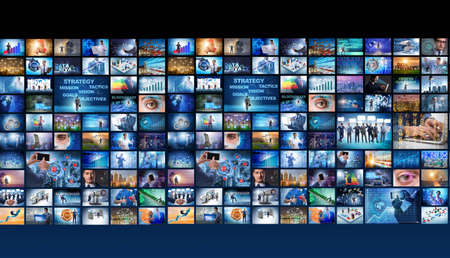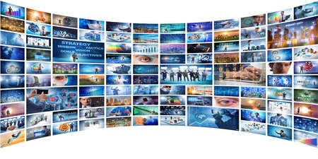 Web streaming media TV video technology and multimedia business internet communication concept: background with endless walls of screens with color photos and colorful displays with different