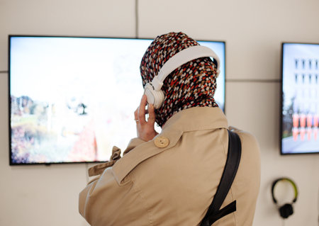 woman in a scarf on her head and a coat is watching TV with headphones