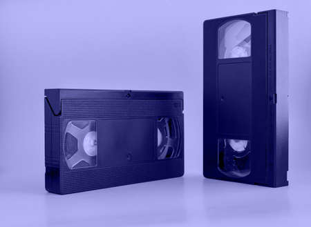 Very peri. The color of the year 2022. Retro VHS video cassettes on color background. Highly popular old video technology from the 80s and 90s.