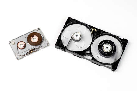 Audio and video cassette tape on white background.