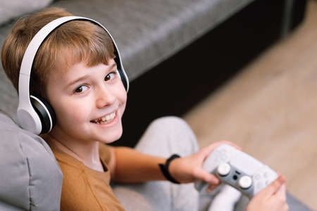 Happy boy playing video games holding game controller sitting on the coach in living room