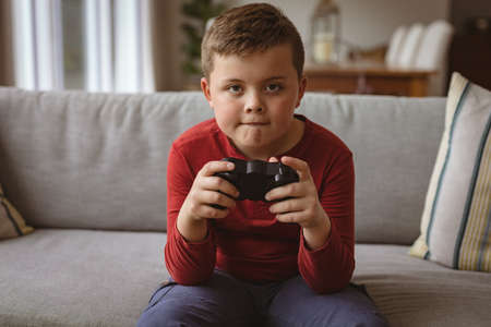 Caucasian boy playing video games sitting on the couch at home. gaming and entertainment concept