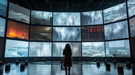 Contemplative figure before a vast video wall of images, showcasing the power of multimedia technology to captivate and inform