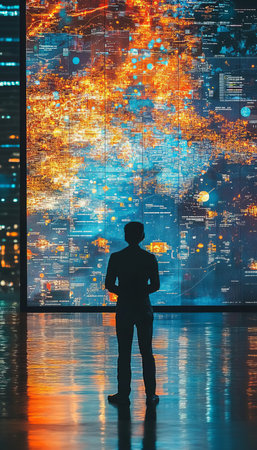 Tech Entrepreneur Contemplates Digital Wall Displaying Cityscape and Data Visualizations at Night