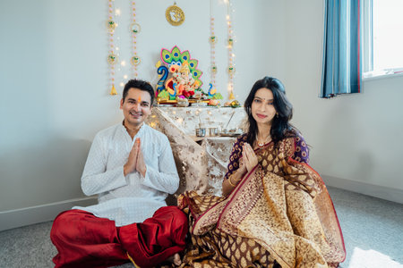 Smiling Indian couple dressed in traditional wear sitting at home altar, adorned with decors and offerings for god Ganesh after festive celebration. Indian culture, hindu ritual and customs.