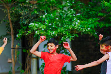 Cute indian little child’s group playing holi. Holi is colors festival in india