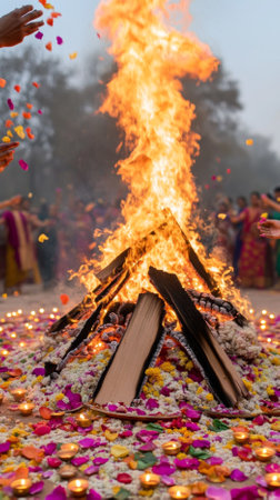 Bonfire with flowers and candles during Holika Dahan celebration in India, AI Generated
