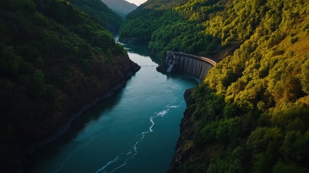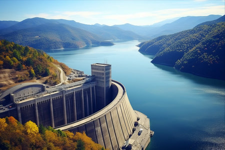 a hydroelectric power plant with a dam and water reservoir, surrounded by forests, created with generative ai